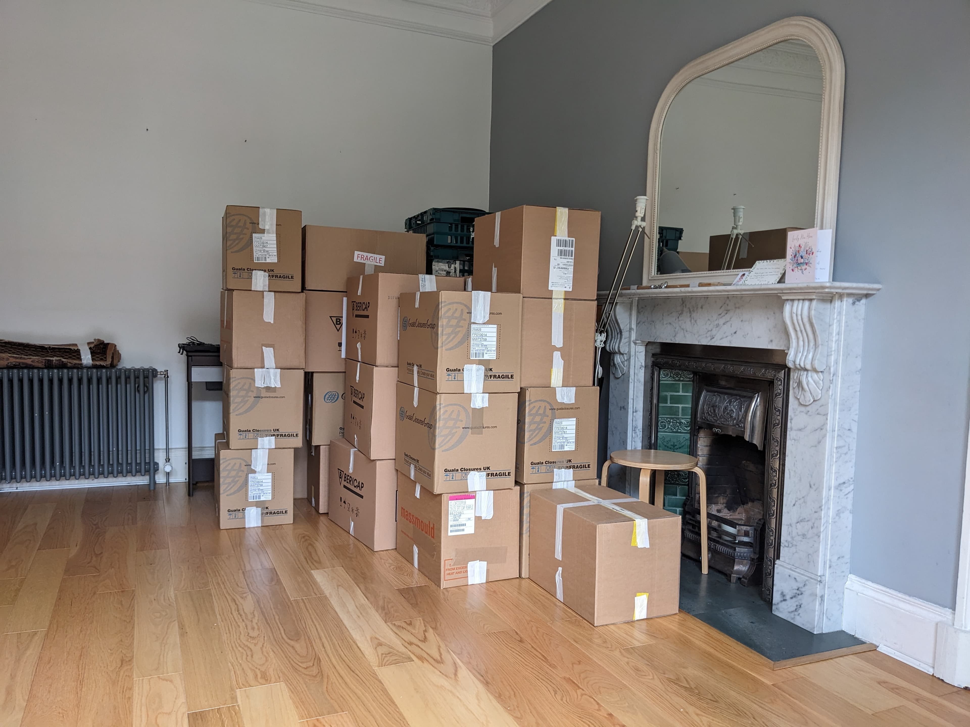 The removal team are back and it’s crunch time. With a bit of tricky manoevering the sofa makes it out the awkward doorway, our many guitars and keyboards are safely stowed and the kitchen pack up proceeds with pace.
